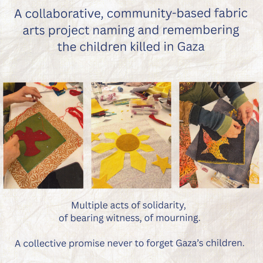 Each Child a Light is a participatory fabric-arts project honouring and remembering the children of Gaza murdered in Isreal’s ongoing genocide.